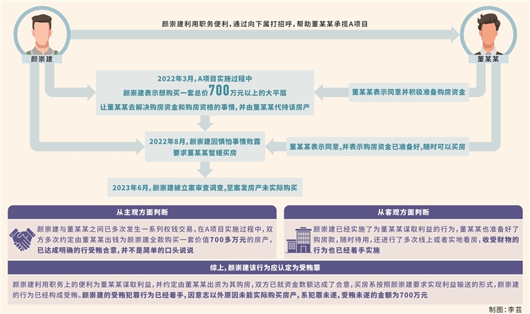 本案中,顏崇建利用職務上的便利為董某某承攬環(huán)衛(wèi)項目提供幫助,并約定由董某某出資為其購買一套房產,因顏崇建被查處,房產尚未實際購買,該行為如何定性?