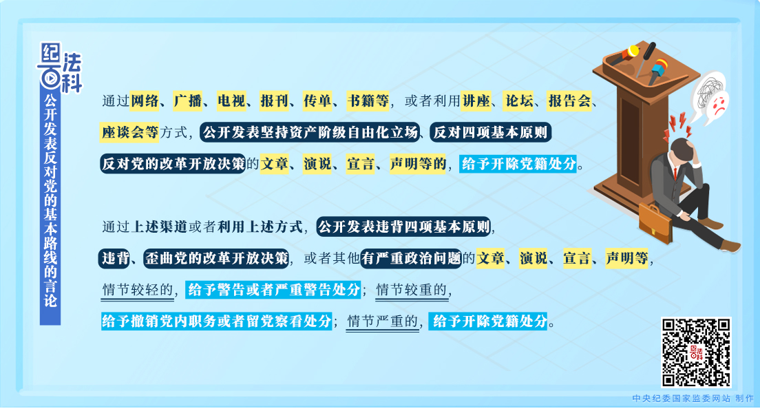 《中國共產(chǎn)黨紀律處分條例》第五十條第一款規(guī)定,通過網(wǎng)絡(luò)、廣播、電視、報刊、傳單、書籍等,或者利用講座、論壇、報告會、座談會等方式,公開發(fā)表堅持資產(chǎn)階級自由化立場、反對四項基本原則,反對黨的改革開放決策的文章、演說、宣言、聲明等的,給予開除黨籍處分。第五十一條第一款第一項規(guī)定,通過上述渠道或者利用上述方式,公開發(fā)表違背四項基本原則,違背、歪曲黨的改革開放決策,或者其他有嚴重政治問題的文章、演說、宣言、聲明等,視情節(jié)輕重給予警告直至開除黨籍處分。