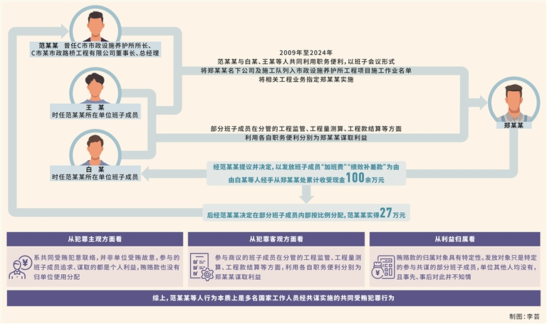 2009年至2024年,范某某與單位時(shí)任部分班子成員白某、王某等人共同利用職務(wù)便利,以班子會(huì)議形式,將鄭某某名下公司及施工隊(duì)列入市政設(shè)施養(yǎng)護(hù)所工程項(xiàng)目施工作業(yè)名單,將相關(guān)工程業(yè)務(wù)指定鄭某某實(shí)施,部分班子成員在分管的工程監(jiān)管、工程量測(cè)算、工程款結(jié)算等方面,利用各自職務(wù)便利分別為鄭某某謀取利益。2009年至2024年,經(jīng)范某某提議并決定,以發(fā)放班子成員“加班費(fèi)”“績(jī)效補(bǔ)差款”為由,由班子成員白某等人經(jīng)手,從鄭某某處累計(jì)收受現(xiàn)金100余萬(wàn)元,后經(jīng)范某某決定在部分班子成員內(nèi)部按比例分配,范某某實(shí)得27萬(wàn)元。