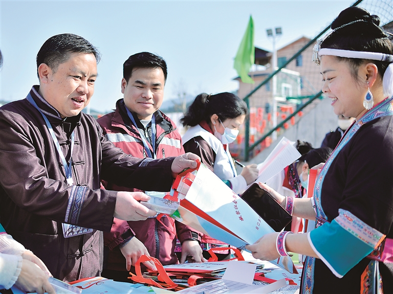 改進(jìn)文風(fēng),要將文件精神轉(zhuǎn)化為群眾看得懂、用得上的“明白紙”,推動政策在基層落地生根。圖為廣西壯族自治區(qū)三江侗族自治縣組織黨員干部到良口鄉(xiāng)良口村開展政策宣傳進(jìn)村寨活動。工作人員以侗語、苗語等多種語言,通俗易懂地為群眾宣講惠農(nóng)惠民政策,提高少數(shù)民族群眾對政策的知曉率。圖片來源:視覺中國
