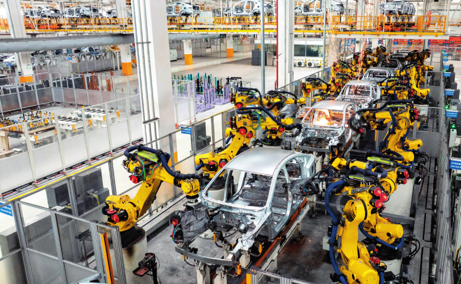 在位于湖南省長(zhǎng)沙市的比亞迪長(zhǎng)沙雨花工廠,機(jī)械臂進(jìn)行車身焊接作業(yè)(2024年3月21日攝)。 陳思汗攝/本刊
